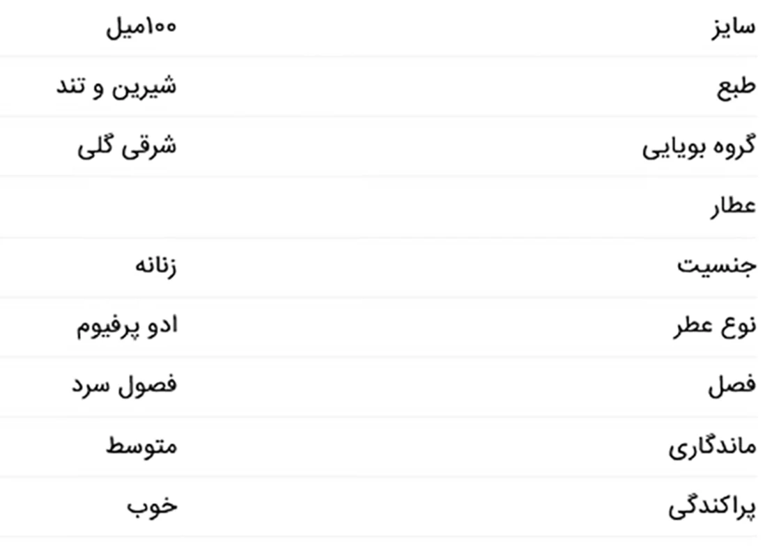 رایحه پایانی:گیاه پاتچولی، علف وتیور، وانیل و عنبر