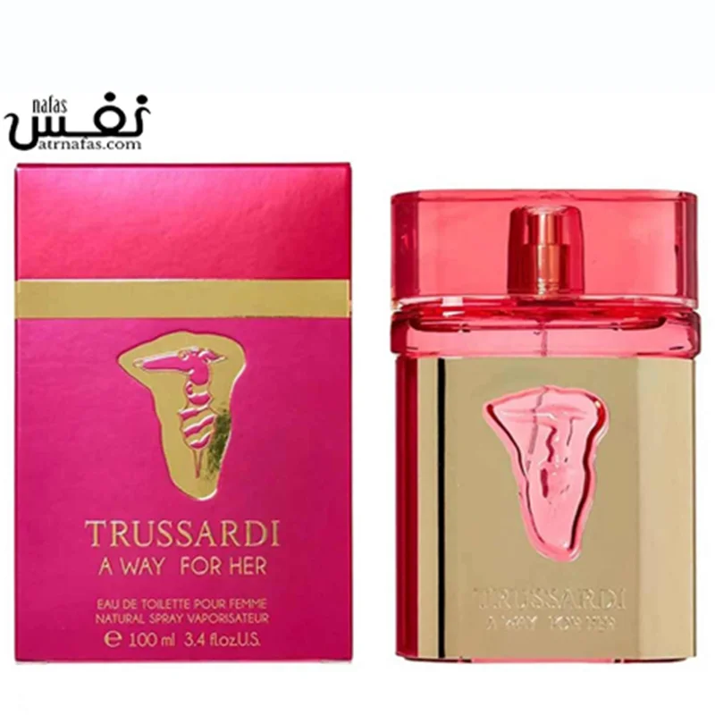 عطر ادکلن تروساردی ا وی زنانه-Trussardi A Way، توسط Lucas Sieuzac برای روزهای گرم تابستانی خلق شد . این محصول که در طبقه ی گلی و شرقی قرار دارد با رایحه ای از ترنج تازه ، هلو آبدار و چای سفید آغاز شده که بعد از گذشت نیم ساعت به قلب شیرینی از گل های مریم ، یاس و بوته یاسمن می رسد . این مواد بر روی بیس گرمی از خس خس ، مشک و وانیل استوار می باشند . رایحه ی غالب آن چای و ترنج بوده که بسیار خاص و فریبنده است و هر بانویی را جلب خود می کند . بطری این عطر، خوشدست و لوکس طراحی شده و موردپسند بانوان امروزی است. روی بطری، نشان تروساردی و نام A Way for Her بهصورت برجسته دیده میشود. درپوش بطری رنگی قرمز دارد و بهخوبی طرح کلی بطری را کامل کرده است.
