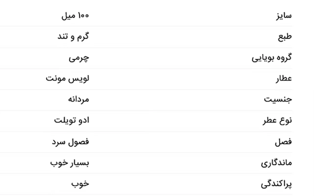رایحه اولیه : ترنج , اسطوخودوس , ترکیبات سبز , سالویا , زیره , ریحان , مرکبات , دانه سرو کوهی , مرزنجوش