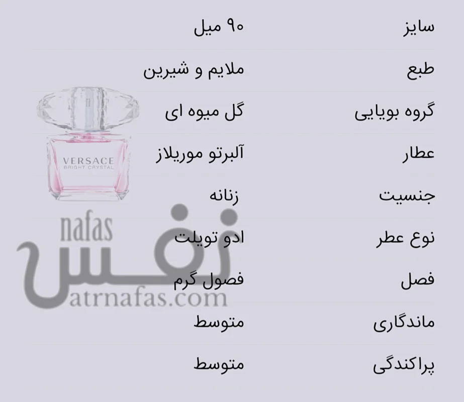 ادکلن ورساچه صورتی-برایت کریستال-Versace Bright Crystal، با رایحه ای ملایم و شیرین همچنین سبکی گلی و میوه ای به بازار معرفی گردید. ادکلن ورساچه صورتی زنانه بهترین انتخاب برای فصول گرم سال می باشد با طراحی الماس گونه ی درپوش خود به یکی از جذاب ترین طراحی های سال های اخیر تبدیل گشته است. روی بطری ورساچه صورتی-برایت کریستال- نشان ورساچه و در پایین آن نام این عطر با رنگ سیاه چاپ شده و دیده میشود. مایع صورتیرنگ درون بطری از روی شیشهی شفاف ادکلن ورساچه صورتی بهخوبی دیده میشود. در بطری با اندازهی بزرگ و طرح الماس مانندش وزن خوبی به ترکیب کلی این عطر اضافه کرده است.
